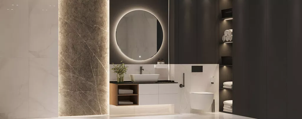 Мягкие линии — в тренде. Закругленные ванные, овальные раковины, светильники с плавными формами, круглые зеркала создают расслабляющую обстановку и превращают функциональную комнату в комфортное убежище от любых проблем.
