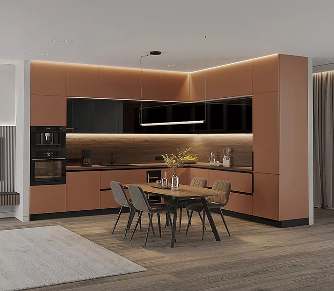 Кухня-столовая в фирменном цвете для российского бренда бытовой техники