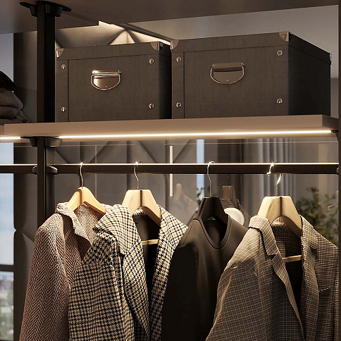 Гардеробная комната 15 представлена двумя секциями в тонированных зеркалах и является частью спальной комнаты. Гардеробная позволяет хранить большое количество разнообразной одежды, вещей, обуви. По одной стороне расположены штанги для одежды, ящик для белья, множество открытых полок, брючница. На другой стороне расположены встроенная гладильная доска, обувница, штанга, полки и ящики. Используется локальная подсветка отдельных зон гардеробной комнаты. Между секциями для комфорта располагается пуф «Трюфель».
