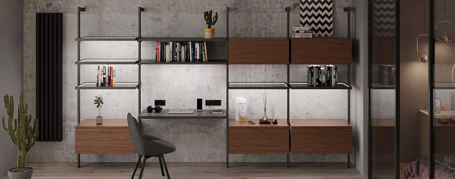 Комплект представляет собой стеллажную систему, оснащённую рабочим столом, полками и ящиками с откидными дверцами. В основе конструкции – металлический каркас. Набор подходит для обустройства домашнего кабинета, библиотеки, рабочего места в офисе, а также рабочей зоны для школьника-подростка. Благодаря удачному сочетанию тёмных оттенков и декора под дерево мебель можно интегрировать в любой интерьер. Оригинальная конструкция, в которой комбинируются различные виды полок, ящиков и рабочих поверхностей, позволяет сэкономить пространство.