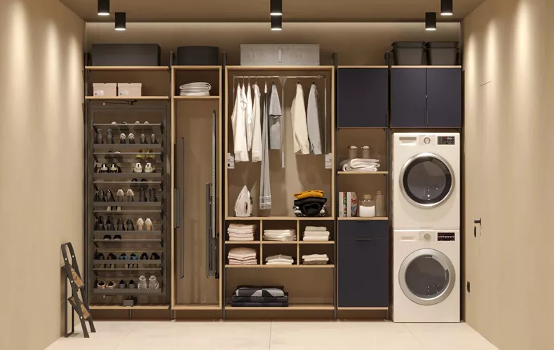 Хотите расширить функциональность вашей гардеробной комнаты? Обустройте в ней прачечную. Это удобный и практичный вариант использования свободного пространства, при котором всё необходимое для ухода за вещами находится в одном помещении. Прачечная с гардеробной оборудованы шкафами, полками, ящиками, штангами и крючками. Также для комнаты предусмотрены подключение коммуникаций, установка бытовой техники и мойки. В качестве системы освещения используются точечные световые элементы. Для разделения функциональных зон установлены раздвижные двери с системой Air – визуально лёгкие, но достаточно прочные конструкции с полотном из стекла.