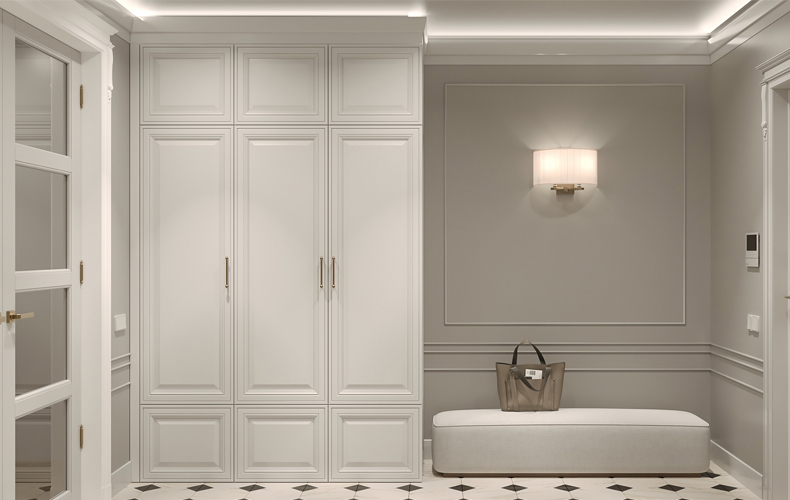 Прихожая 28 представлена двухстворчатым шкафом и угловой секцией с панелью и высоким зеркалом. В шкафу расположены полки, штанга и обувница для сезонного использования. Реечная панель оснащена крючками для одежды. В прихожей также установлен пуф «Лофт 2» в качестве места для сидения.