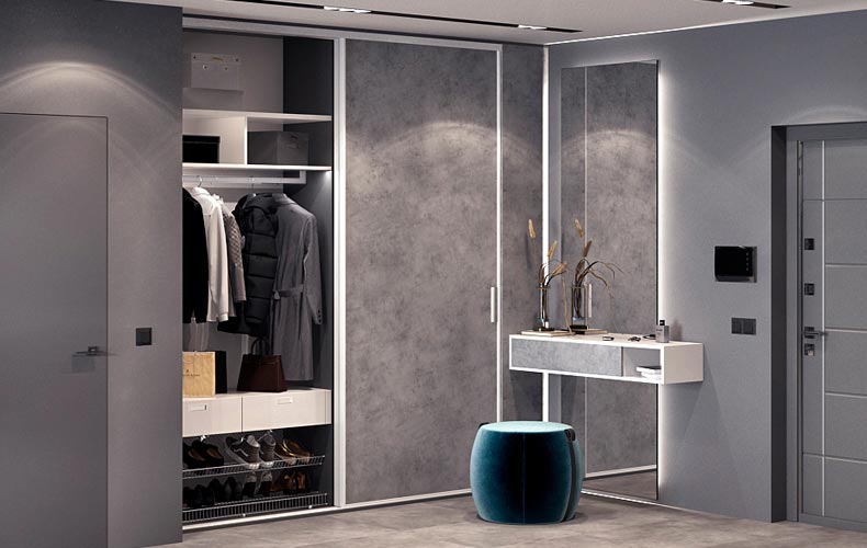 Шкаф-купе и консоль с большим зеркалом расположены в небольшой угловой прихожей. В шкафу предусмотрены полки, ящики и системы хранения для верхней сезонной одежды, обуви и сумок. Как продолжение шкафа используется консоль с зеркалом и ящиками. Одна из раздвижных дверей шкафа выполнена также с использованием зеркала, что добавляет света при имеющемся освещении и визуально расширяет пространство. Для удобства в прихожей размещен пуф.