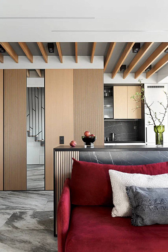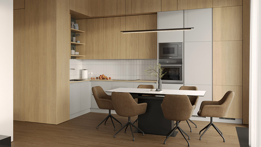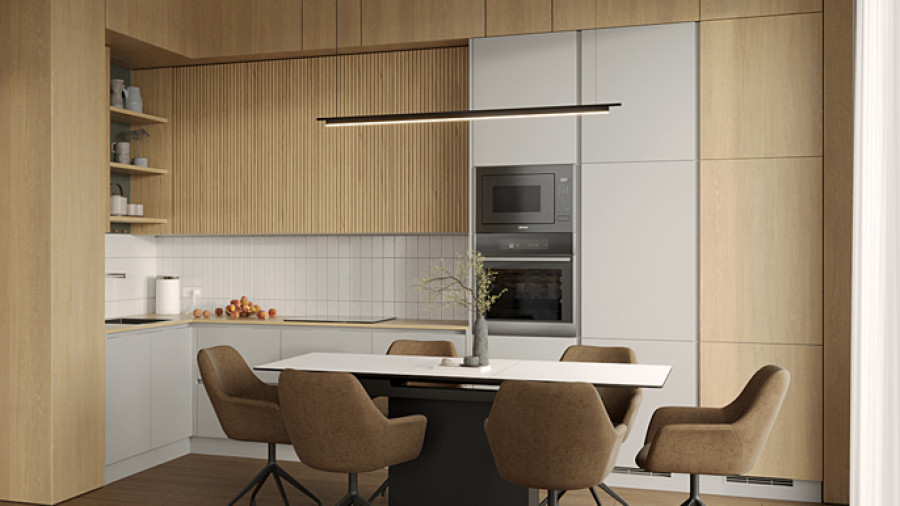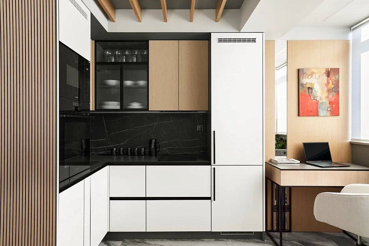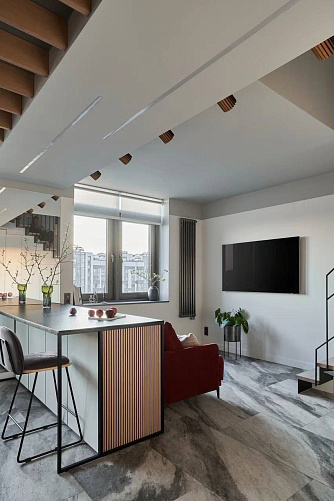 Максимальное удобство в двухуровневой квартире: компактный кухонный гарнитур дополнен барной стойкой и островом.