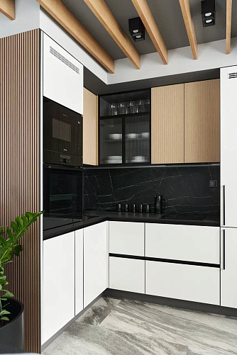 Кухонный гарнитур Маттео 47 выполнен в скандинавском стиле угловой конфигурации. Справа установлены две колонки под встраиваемую бытовую технику. В центральной части расположены напольные и навесные шкафы, в рабочей зону установлена встраиваемая варочная поверхность. В угловой секции установлена мойка со смесителем, а в верхней части расположены полки для открытого хранения.