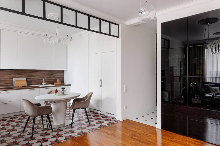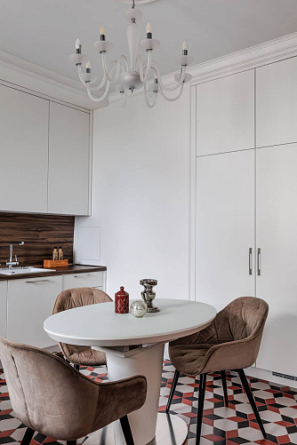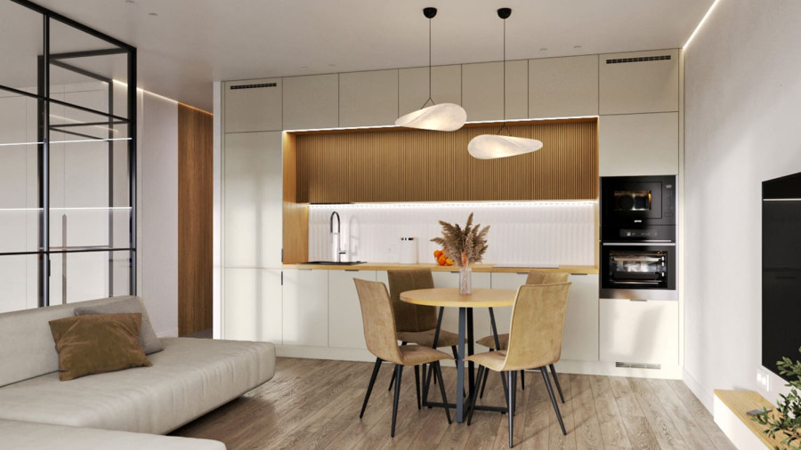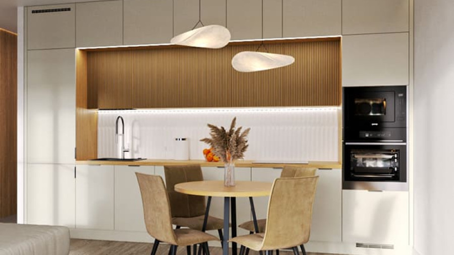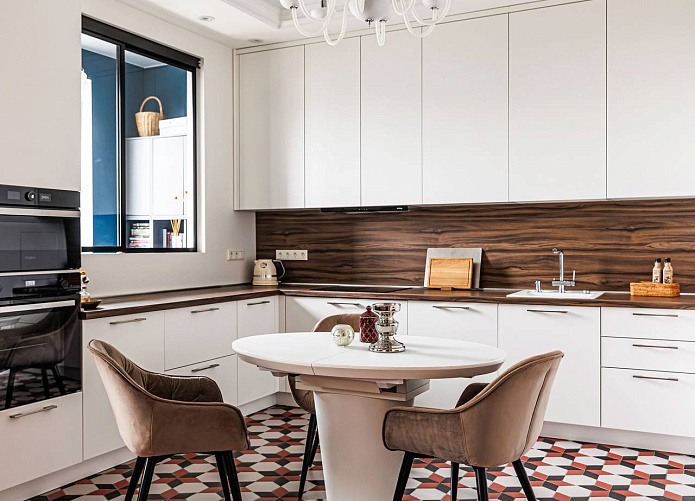 Светлые стены, белый гарнитур и встроенная техника создают ощущение простора, а фартук под дерево добавляют тепла и уюта.